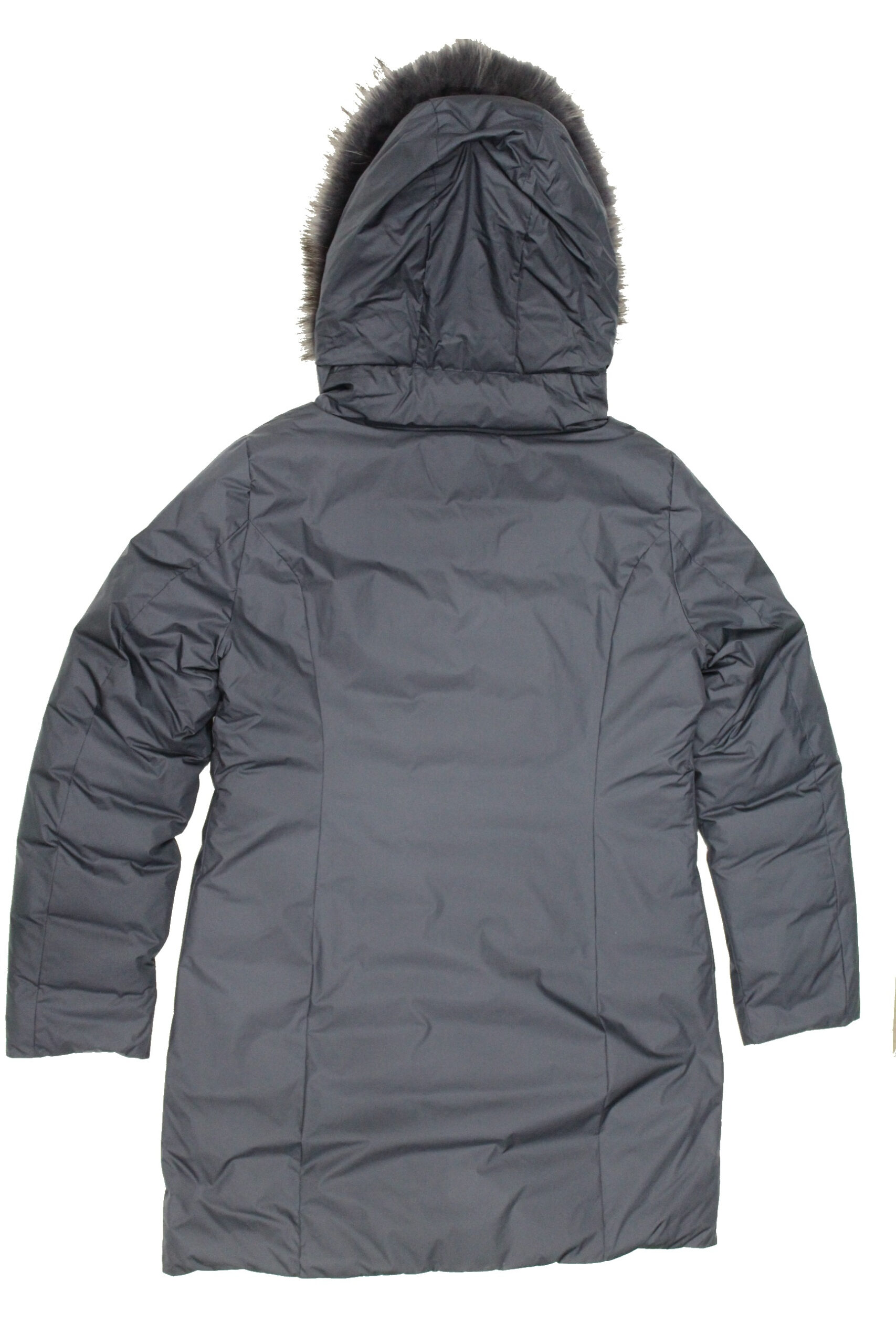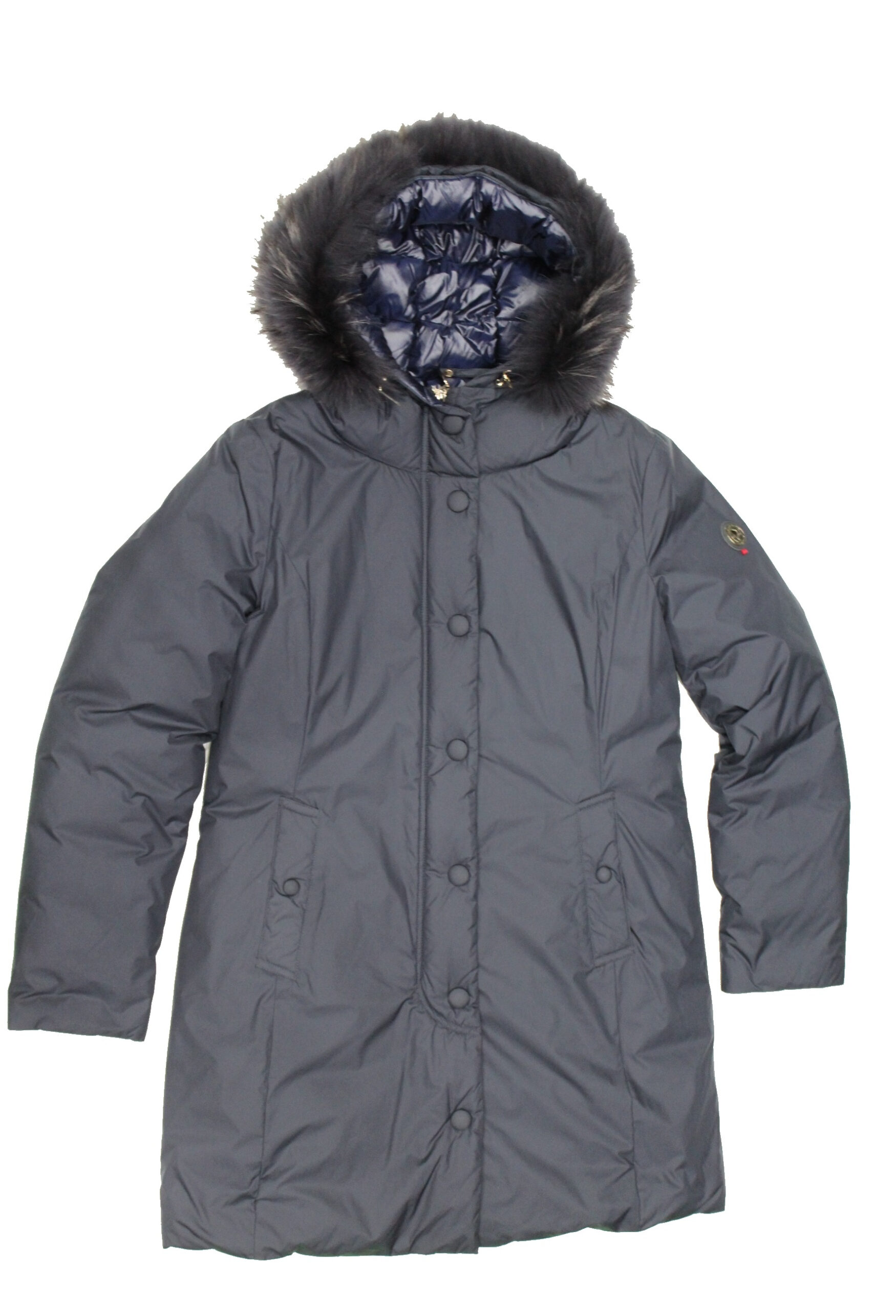 Piumino donna lungo con cappuccio e Pelliccia in tinta, alta performance 5° -10°, imbottitura piuma d’oca, col blu