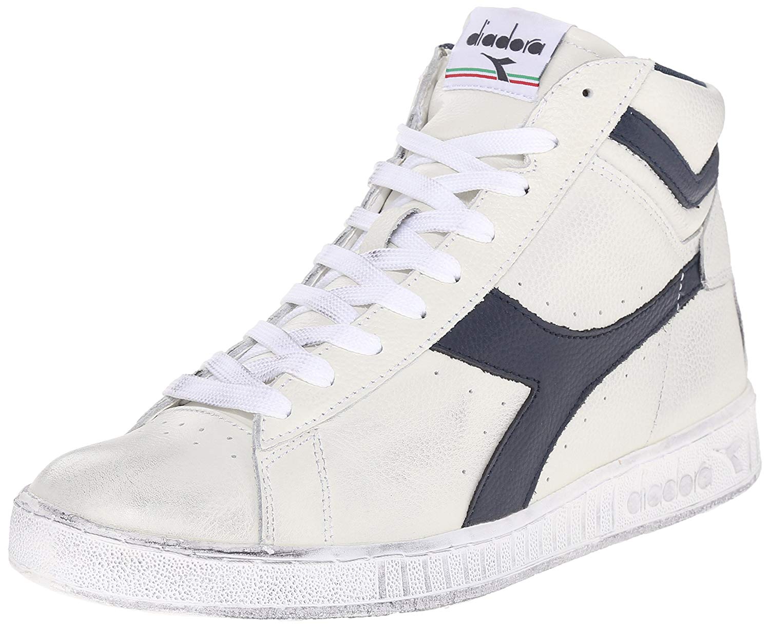 Scarpa mid di ispirazione tennis anni 70 in pelle pieno fiore con logo in pelle in applicazione. Suola a scatola personalizzata vulcanizzata con trattamento di ceratura. .