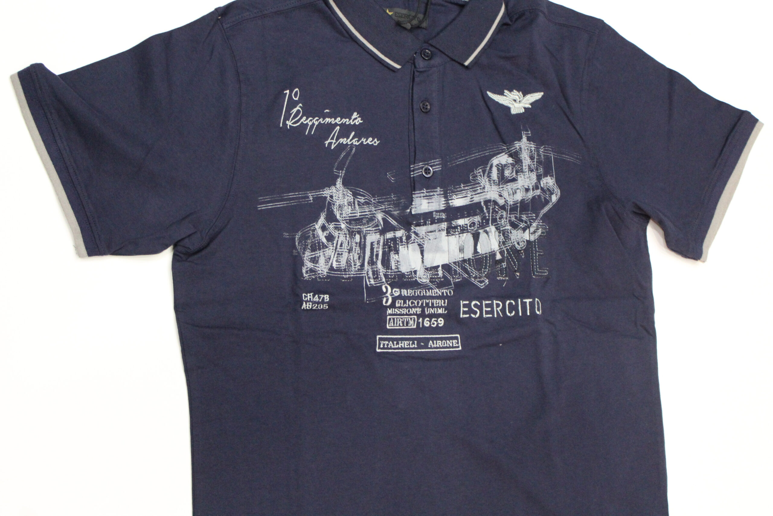 Polo uomo manica corta, tessuto jearsy in coto, stampa elicottero mangusta, col blu