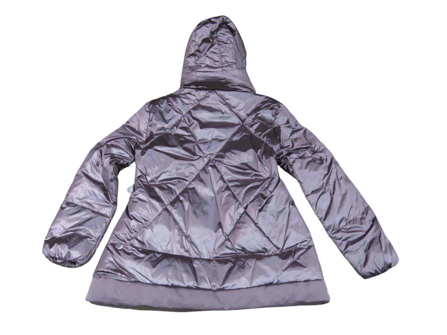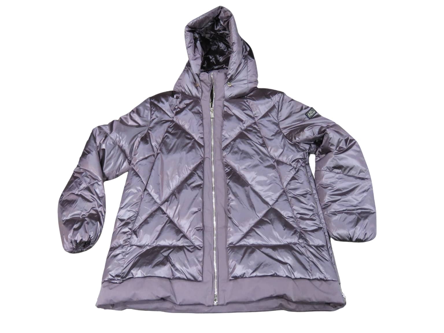 Giubbino piumino donna lungo con cappuccio tessuto esterno nylon e soft shell, imbottitura interna in piuma d’oca, col lilla, zip estetiche laterali, trama cuciture esterne a rombo