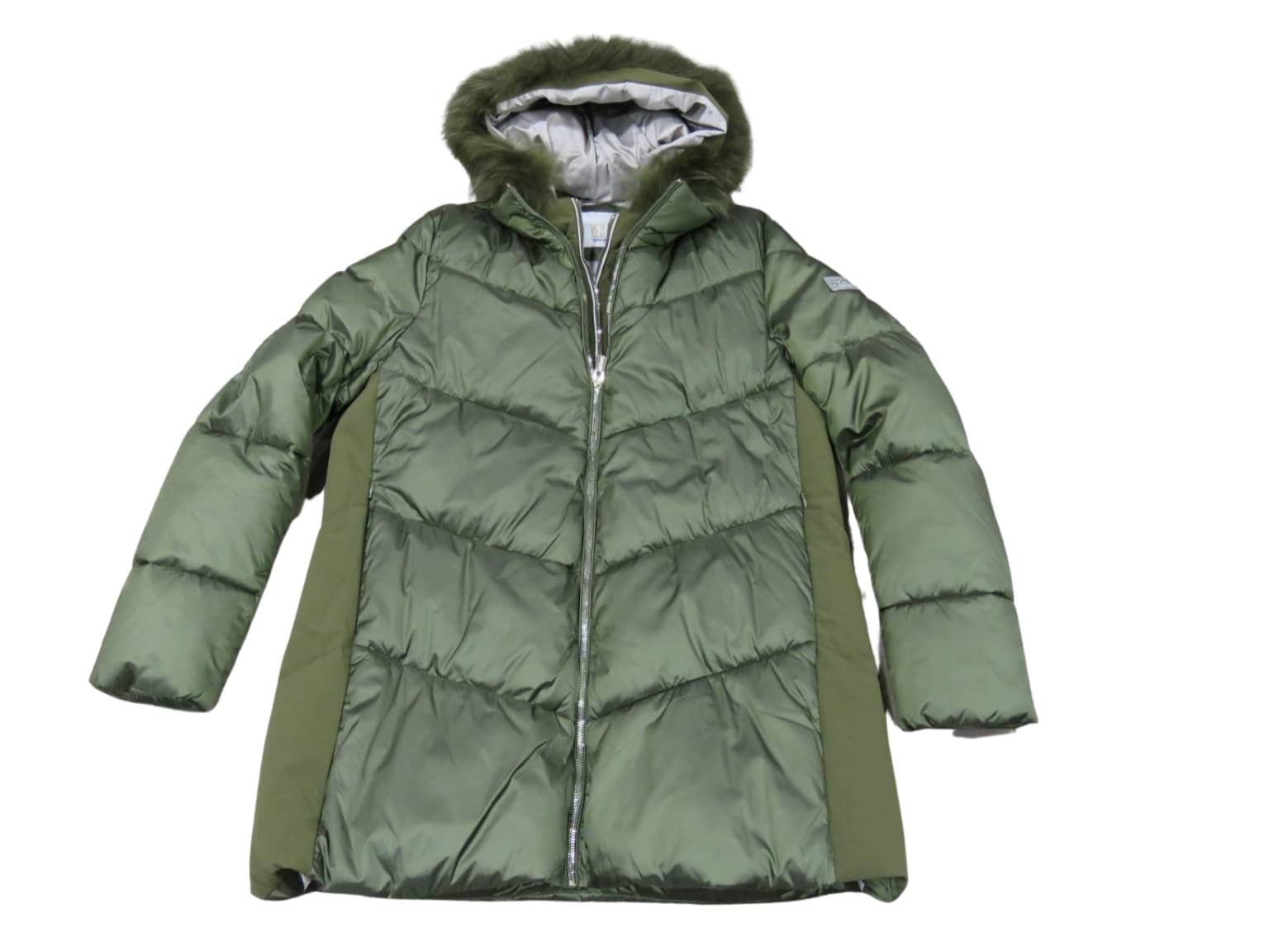 Giubbino piumino donna lungo tessuto esterno nylon e soft shell, imbottitura interna in piuma d’oca, cappuccio con pelliccia e finto gilet staccabili, col verde oliva