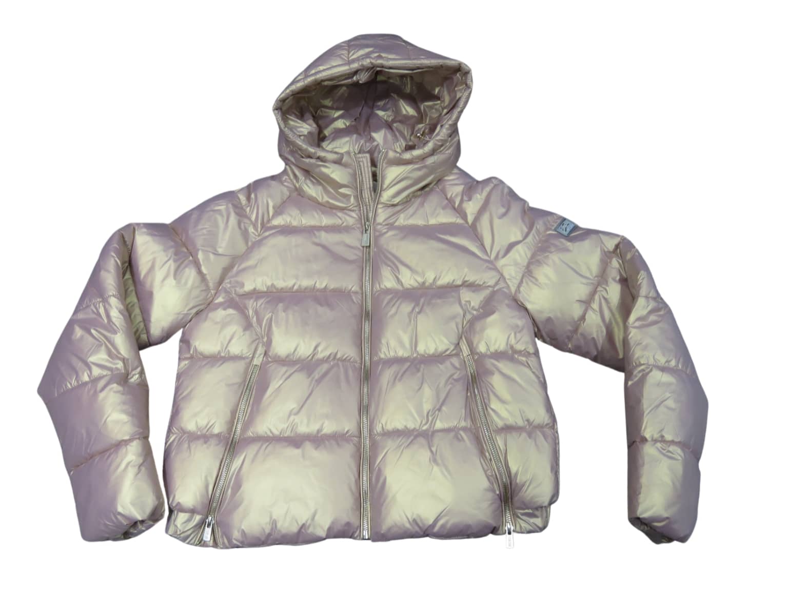 Giubbino piumino donna corto con cappuccio fisso, tessuto esterno nylon , imbottitura interna sintetica, , col verde militare chiaro effetto cangiante