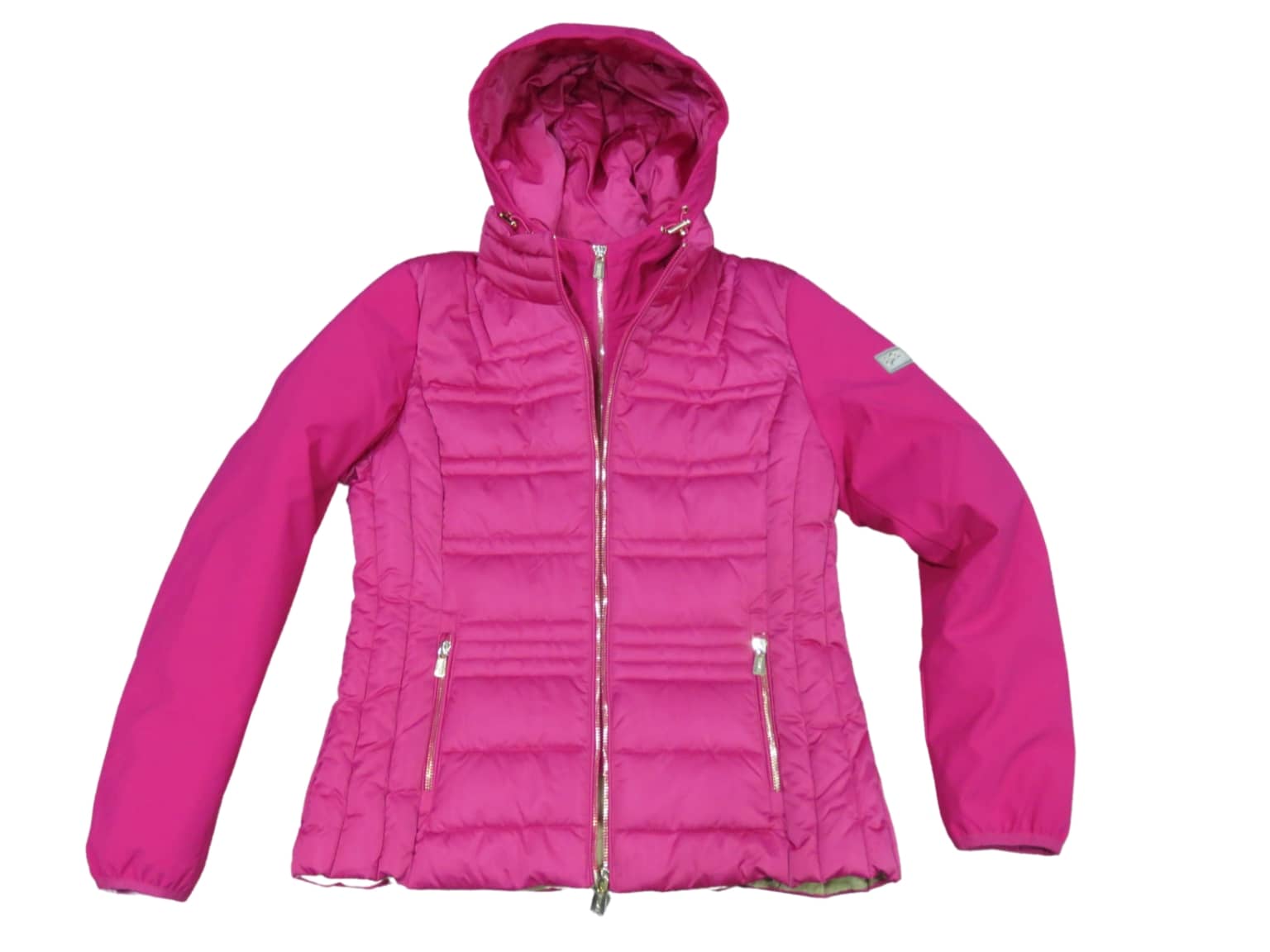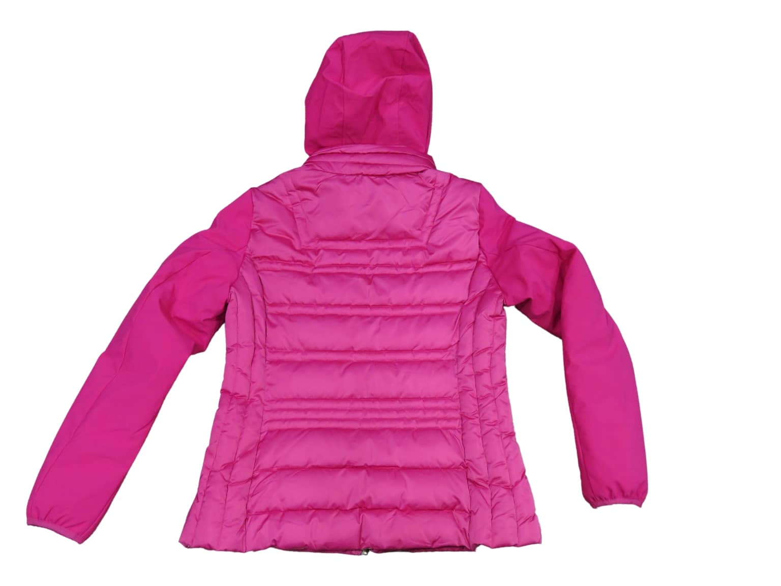 giubbino donna corto con cappuccio e finto gilet staccabili, tessuto esterno in nylon e soft shell, imbottitura interna sintetica, col fuxia