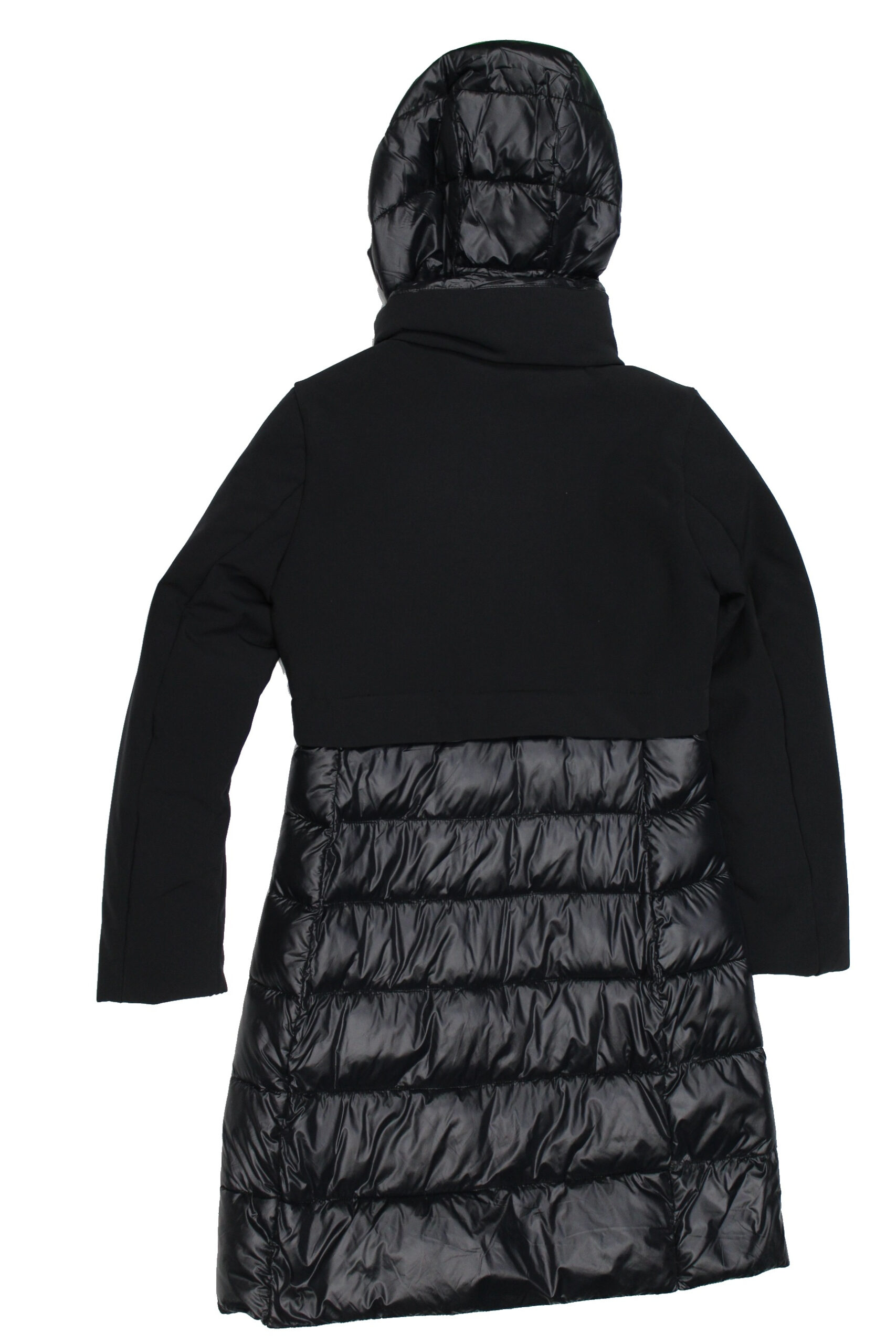 Giaccone Donna Lungo, Col Nero, Cappuccio staccabile, imbottitura in piuma d’oca, doppio tessuto esterno SOFT SHELL/ NYLON
