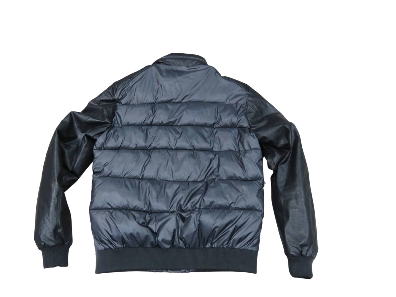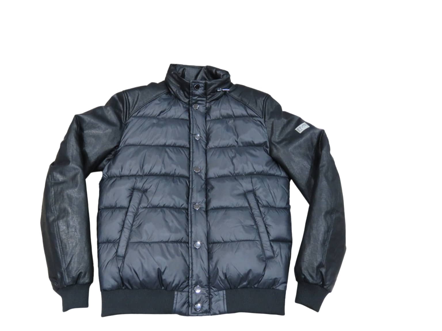 Giubbino uomo corto con elastico in vita e cappuccio interno , tessuto esterno nylon e eco pelle, imbottitura interna sintetica, colore nero