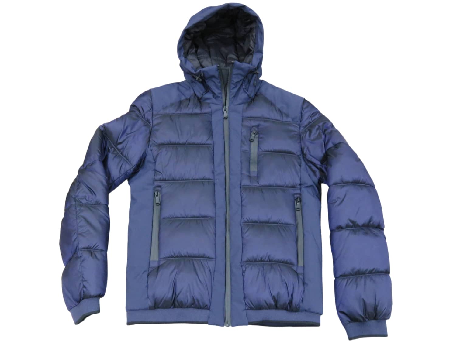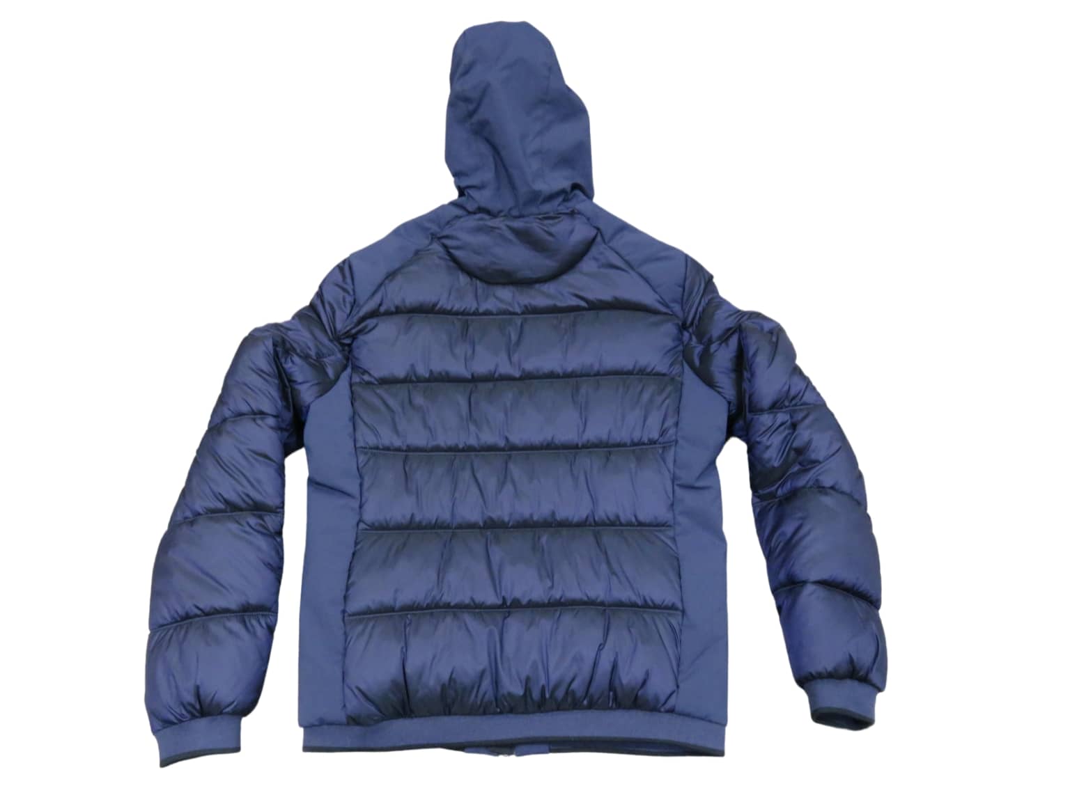 Piumino uomo corto con cappuccio, tessuto esterno nylon e soft shell, imbottitura interna in piuma d’oca, colore blu
